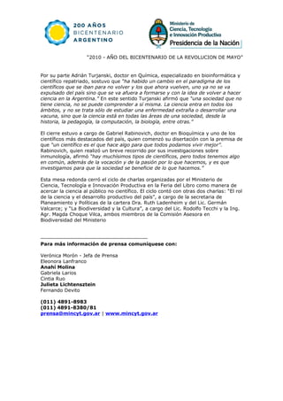 El documento resume una charla en la Feria del Libro entre el ministro de Ciencia, Tecnología e Innovación Productiva y tres investigadores jóvenes sobre el papel de los científicos en la Argentina. Los oradores discutieron los estereotipos de los científicos, la responsabilidad de transferir el conocimiento a la sociedad, y los cambios recientes que han visto más científicos regresar al país luego de capacitarse en el extranjero.
