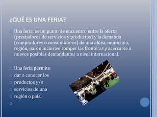 Una feria es un evento donde productores y proveedores se reúnen con compradores y consumidores para promover y vender sus productos y servicios. Los objetivos principales de una feria incluyen la venta y compra de bienes, investigar la competencia, hacer contactos y alianzas estratégicas. Organizar ferias apoya el desarrollo económico local al vincular el espíritu empresarial con el crecimiento regional.