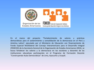 El documento describe un programa de formación docente llamado "Construyendo Aulas Democráticas" que busca fortalecer los valores democráticos en estudiantes y maestros. Como parte del programa, se realizó una feria virtual llamada "PROYECDEMOS" donde maestros de Lima, Ayacucho y Ucayali presentaron 52 proyectos de aulas democráticas. Los proyectos ganadores de cada región fueron seleccionados por jurados especializados.
