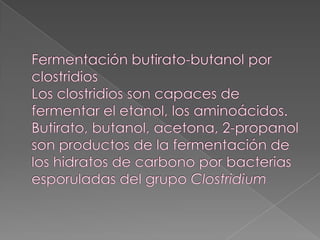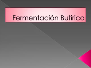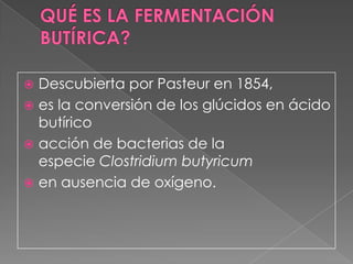 La fermentación butírica es la conversión de glúcidos en ácido butírico por la acción de bacterias Clostridium butyricum en ausencia de oxígeno. Puede ocurrir de forma no deseada en procesos de fermentación y causar problemas como mal olor e intoxicación si los niveles son altos. Se recomienda mantener un pH menor a 4.2 y evitar temperaturas entre 20-50°C para controlar la fermentación butírica no deseada.