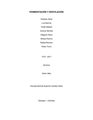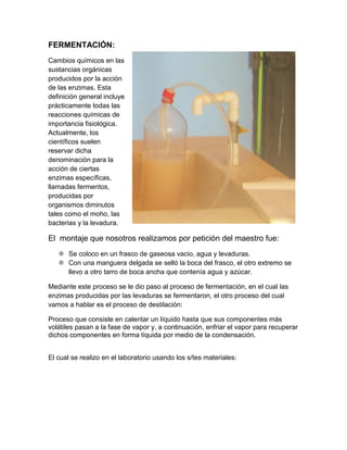 El documento describe los procesos de fermentación y destilación. Explica que la fermentación implica cambios químicos en sustancias orgánicas producidos por enzimas, mientras que la destilación involucra calentar un líquido para separar sus componentes volátiles mediante evaporación y condensación. Luego detalla los montajes realizados en el laboratorio para fermentar agua y levadura y destilar el posible alcohol resultante, identificándolo finalmente a través de pruebas de sabor y combustión.