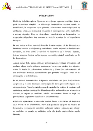 MAQUINARIA Y EQUIPOPARA LA INDUSTRIA ALIMENTARIA 1 INTRODUCCIÓN El objetivo de la biotecnología (bioingeniería) es obtener productos metabólicos útiles a partir de materiales biológicos. La biotecnología comprende de dos fases distintas: la fermentación y la recuperación de los productos. Para el cultivo de microorganismos en condiciones óptimas, así como para la producción de microorganismos en los metabolitos o enzimas deseadas, deben ser desarrollados procedimientos de fermentación. La recuperación del producto lleva a cabo de la extracción y purificación de los productos biológicos. De esta manera se llevo a cabo el desarrollo de estas maquinas de los fermentadores intentando satisfacer a trabajadores y consumidores, con las maquinas de fermentadores industriales, de buena calidad y satisfacer las necesidades de la industria moderna, teniendo en cuenta el criterio de la ergonomía como patrón principal para el mejor uso de los fermentadores. Aunque muchas de las técnicas utilizadas en la recuperación biológica o bioquímica del producto solapan con las utilizadas estrictamente en procesos químicos (por ejemplo, separación, destilación, calentamiento, enfriamiento y desecación), está aumentando el uso de métodos diseñados específicamente para productos biológicos, como son la cromatografía o la electroforesis. En los procesos de fermentación de ingeniería es solamente una ayuda en el desarrollo del proceso, y el centro de atención son la regulación de los procesos biológicos y los microorganismos. Todos los métodos, como la manipulación genética, la regulación del metabolismo mediante optimización del medio de cultivo y el suministro de un suministro adecuado de oxigeno en condiciones estériles son solamente formas de dirigir los procesos hacia los productos adecuados de los fermentadores. Cuando más seguidamente se conocen los procesos durante el crecimiento y la formación de se necesita en los fermentadores, mayor es la posibilidad de operar los procesos de fermentación completamente automático, gobernado mediante ordenador, para obtener un metabolito, por ejemplo, un antibiótico, no ha sido llevado a cabo todavía a escala industrial.