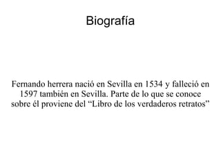 Fernando Herrera nació en Sevilla en 1534 y falleció en 1597. Fue un poeta español renacentista conocido por su estilo lírico y obras como "Rojo sol, que con hacha luminosa". Escribió poemas de amor inspirados en temas petrarquistas donde exploraba el sufrimiento causado por el amor no correspondido a través de la naturaleza.