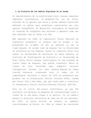 Este documento resume la historia de los medios digitales en el mundo y Venezuela. Explica que los primeros medios digitales como el telégrafo surgieron con el descubrimiento de la electricidad. Luego, en 1968 se estableció la primera red de computadoras llamada Arpanet, que eventualmente evolucionó a lo que hoy conocemos como Internet. En Venezuela, los primeros sitios web aparecieron en 1996 y llevaron a un auge de proyectos digitales. El crecimiento de redes sociales en la década de 2000 también influyó en los