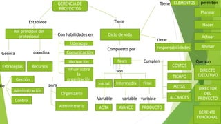 El documento presenta un mapa conceptual sobre la gerencia de proyectos y el ciclo de vida de un proyecto. La gerencia de proyectos establece el rol principal del gerente de proyectos para organizar y administrar los recursos a través de estrategias y control, con el fin de cumplir las metas dentro del tiempo y costos planeados. El ciclo de vida de un proyecto está compuesto por fases inicial, intermedia y final que permiten planear, hacer y revisar el proyecto, generando un producto final.