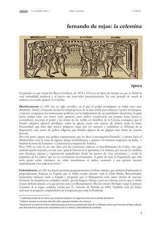 1) La obra La Celestina se sitúa en el periodo de los Reyes Católicos, cuando se mezclaban la mentalidad medieval y las nuevas ideas renacentistas.