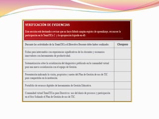 Este documento describe las temáticas para integrar las tecnologías de la información y la comunicación (TIC) en la gestión educativa y el deseño de un Plan de Gestión de uso de TIC para una institución educativa. Las temáticas incluyen comprender la importancia del trabajo colaborativo, diseñar las primeras etapas de un plan de gestión TIC, y contribuir al diseño de la visión y objetivos del plan.