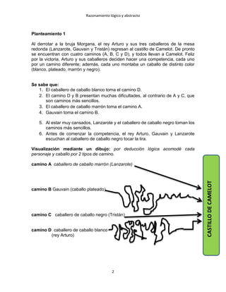 El documento presenta dos planteamientos o problemas que involucran razonamiento lógico y abstracto. El primer planteamiento involucra a los caballeros de la mesa redonda que toman caminos diferentes hacia el castillo de Camelot. El segundo planteamiento trata sobre tres políticos que almorzaban juntos con corbatas de colores diferentes. Ambos problemas son resueltos mediante dibujos y razonamiento lógico deductivo.