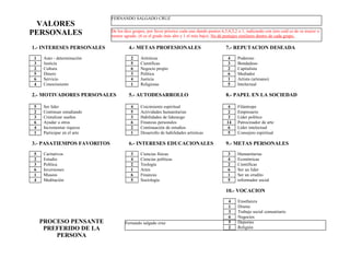 Este documento presenta una serie de adjetivos y grupos para que la persona indique cuáles se ajustan mejor o peor a su descripción personal. Contiene secciones sobre intereses personales, motivadores, pasatiempos favoritos, metas profesionales y personales, y roles deseados en la sociedad. La persona completa el ejercicio evaluando cada adjetivo u opción para proveer información sobre su estilo y preferencias personales.