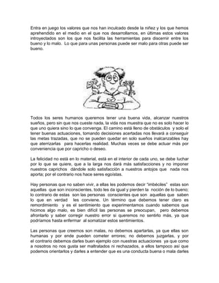 El documento discute la naturaleza de la ética y lo que constituye el bien y el mal, señalando que estas nociones dependen del contexto cultural y las circunstancias individuales. También explora temas como la libertad de elección, los valores aprendidos desde la niñez, la sexualidad humana en comparación con los animales, y la importancia de tomar decisiones informadas que beneficien a los demás.