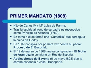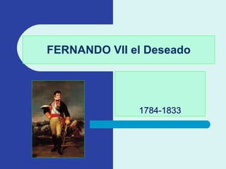 El documento resume la vida y los principales periodos de gobierno de Fernando VII, rey de España entre 1808 y 1833. Resume su primer mandato en 1808, el sexenio absolutista entre 1814 y 1820, el trienio liberal de 1820 a 1823, y la década ominosa de 1823 a 1833, durante la cual Fernando VII murió sin un hijo varón, creando una disputa sobre la sucesión.