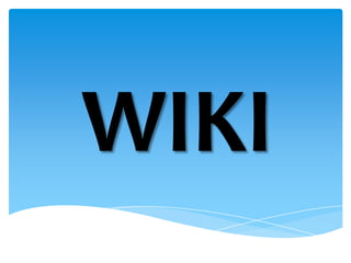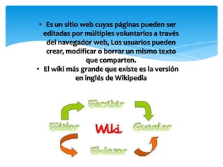 Un wiki es un sitio web cuyas páginas pueden ser editadas por múltiples usuarios a través de un navegador. La ventaja principal es que permite crear y mejorar páginas de forma inmediata dando libertad a los usuarios. La desventaja es que la información no es 100% segura debido a que cualquiera puede modificar las páginas sin contrastar la información. Wikispaces es una herramienta wiki que permite a múltiples personas crear documentos de manera coordinada a través de ediciones, discusiones y