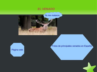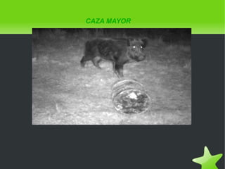 El documento presenta información sobre varias especies de caza mayor encontradas en España y otras partes del mundo, incluyendo el venado, el jabalí, el gamo, el muflón, el arrui y el lobo. Proporciona detalles sobre las características físicas, el hábitat y la distribución geográfica de cada especie. También incluye enlaces a fotos de cada animal.
