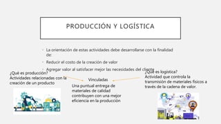Este documento describe los conceptos clave de la cadena de suministro y la producción en los negocios internacionales. Explica que la logística y la producción deben enfocarse en reducir costos y agregar valor para el cliente. También discute estrategias para decidir dónde producir, como concentración vs. descentralización, y considerar factores como costos, mercados y barreras comerciales. Finalmente, cubre temas como inventarios justo a tiempo y el papel facilitador de la tecnología de la información en la administración de la cadena