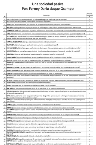 Este documento presenta 40 preguntas sobre temas relacionados con el uso de tecnología y recursos en la sociedad, y propone soluciones tecnológicas para cada una. La mayoría de las preguntas (28) se enfocan en mejorar el servicio y uso responsable de recursos como energía, gas natural, agua, internet y telefonía. Las otras preguntas abordan temas como el maltrato, drogadicción, tiempo libre de los jóvenes y mejorar la educación y salud.