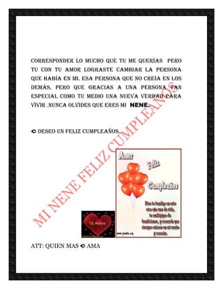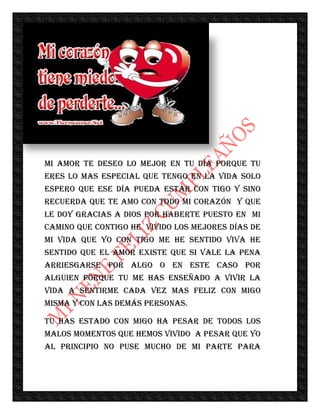 La carta desea un feliz cumpleaños a la persona amada y expresa gratitud por haberla puesto en su camino y haberle enseñado a vivir la vida feliz. Agradece por el amor y apoyo durante los malos momentos a pesar de que al principio no correspondió el afecto, pero el amor de la persona cambió quién era y le dio una nueva perspectiva para vivir.