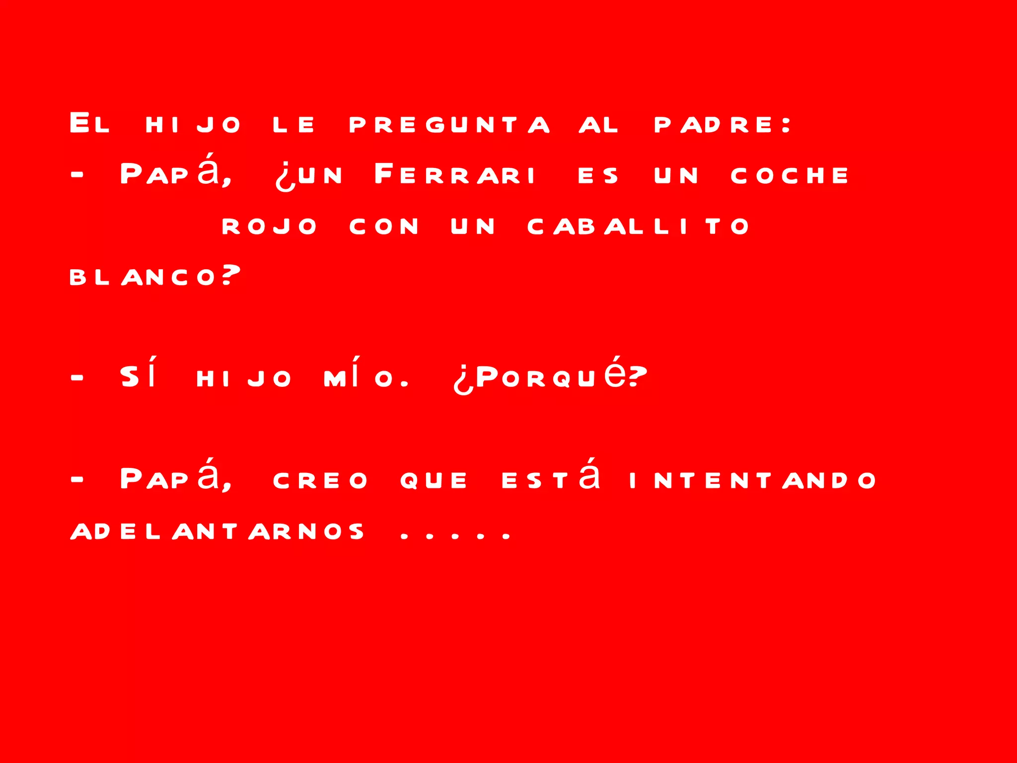 Un niño le pregunta a su padre si un Ferrari es un coche rojo con un caballito blanco en el capó, a lo que el padre responde afirmativamente. El niño entonces le dice a su padre que cree que ese coche está intentando adelantarlos.