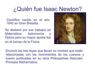 Isaac Newton enunció las tres leyes del movimiento que llevan su nombre, las cuales fueron publicadas en su obra Philosophiae Naturalis Principia Mathematica. La primera ley establece que un cuerpo permanece en reposo o movimiento uniforme a menos que actúe una fuerza sobre él. La segunda ley indica que la aceleración de un cuerpo es proporcional a la fuerza aplicada e inversamente proporcional a su masa. La tercera ley afirma que a toda acción le corresponde una reacción igual y en sentido contrario.