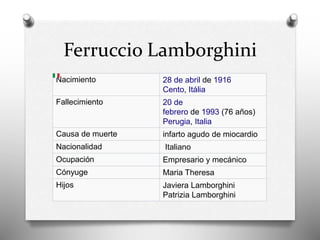 Ferruccio Lamborghini fue un fabricante italiano de tractores que fundó la marca de automóviles deportivos Lamborghini después de tener problemas con su Ferrari. Insatisfecho con la calidad de su Ferrari, se quejó con Enzo Ferrari, quien lo insultó. Esto motivó a Lamborghini a fundar su propia compañía para construir autos mejores que los de Ferrari. Contrató ingenieros de Ferrari y lanzó su primer modelo, el 350 GT, que superó las críticas que había hecho a Ferrari. Lamborghini