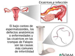 El documento habla sobre la infertilidad. Explica que entre el 15% de las parejas sufren infertilidad, siendo los factores femeninos responsables del 40% de los casos, los factores masculinos del otro 40% y ambos factores en el 20% restante. También describe las principales causas de infertilidad masculina y femenina como la anovulación, endometriosis y problemas en las trompas de Falopio. Finalmente, resume las opciones de tratamiento disponibles como la inducción de ovulación, inseminación artificial e IVF, dirigidas ya sea al hombre