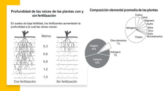 El documento proporciona información sobre diferentes tipos de fertilizantes, incluyendo fertilizantes simples, multinutrientes y micronutrientes. Explica cómo calcular las dosis de fertilizantes requeridas para una parcela de tierra basada en el contenido de nutrientes y el área. También describe los síntomas de deficiencia de nutrientes que se manifiestan en las plantas y los métodos para determinar las necesidades de nutrientes de los cultivos, como el análisis de suelos y tejidos de plantas.