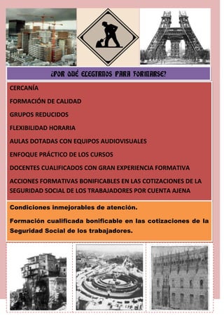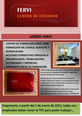 Este documento presenta un centro de formación que ha estado operando desde 2008 en las provincias de Cuenca, Albacete y Guadalajara. Ofrece una variedad de cursos de formación dirigidos a desempleados, trabajadores, autónomos y empresas en diversas áreas como la Tarjeta Profesional de la Construcción, administración, oficios de la construcción, prevención de riesgos laborales, y sector metal. El centro enfatiza su cercanía, formación de calidad impartida por docentes cualificados, aulas equipadas, y en