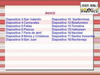 El documento presenta una serie de festividades y celebraciones tradicionales que tienen lugar en España y otros países, incluyendo San Valentín, Carnavales, Fallas, Pascua, Feria de Abril, Moros y Cristianos, San Juan, Sanfermines, El Botafumeiro, La Tomatina, Halloween, Navidad, Santos Inocentes y Nochevieja. Para cada festividad se proporciona brevemente su fecha, origen y actividades asociadas.