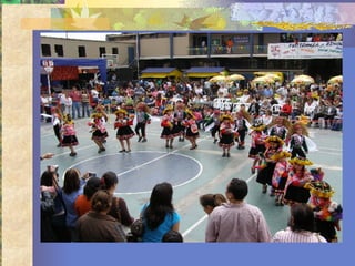 Este documento describe una danza tradicional llamada "Qaswa kio" de la comunidad de Laq'o en Perú. La danza rinde homenaje a un ave de buen augurio llamada "kío" y se realiza durante las cosechas para celebrar una buena producción. El vestuario tradicional incluye monteras, ponchos, faldas y otros atuendos típicos de la zona. Los estudiantes practicaron durante horas para perfeccionar la coreografía de la danza.