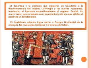 El documento describe el sistema feudal que surgió en Europa entre los siglos IX y XV. El feudalismo se formó espontáneamente como respuesta a la anarquía y las invasiones posteriores al colapso del Imperio Carolingio. Se basaba en la dependencia de los más débiles hacia los terratenientes más poderosos a cambio de protección. Estableció una sociedad triestamental descentralizada gobernada por la relación entre vasallos y señores feudales.