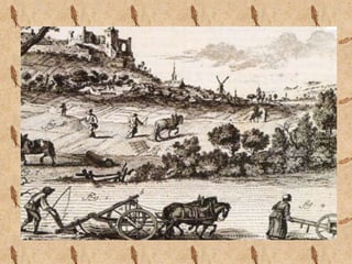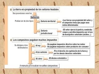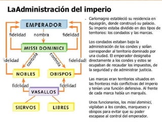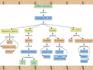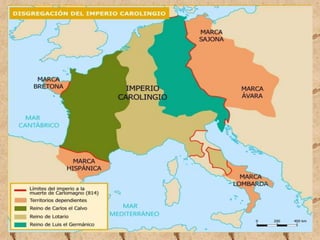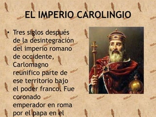 El documento describe el origen y desarrollo del sistema feudal en Europa desde el Imperio Carolingio hasta su fragmentación. Carlomagno unificó parte de Europa y estableció las bases del feudalismo al otorgar tierras a la nobleza a cambio de lealtad y servicios militares. Con el tiempo, los reyes se debilitaron y tuvieron que ceder autoridad a los señores feudales, dando paso a una Europa fragmentada en numerosos reinos y señoríos.