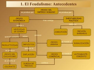 El documento describe el sistema feudal que surgió en Europa después de la caída del Imperio Romano. 1) La sociedad feudal estaba jerarquizada, con el rey en la cima, seguido por la nobleza y el clero. Debajo estaban los campesinos, divididos en siervos y villanos. 2) Los nobles poseían tierras llamadas feudos, que cedían a vasallos a cambio de lealtad y servicios. Los vasallos gobernaban castillos y tierras trabajadas por campesinos. 3) Estos campesinos viv