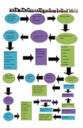 El documento describe el proceso de investigación para resolver problemas tecnológicos a través de la conformación de 8 equipos de trabajo, la generación de 40 problemas y 5 criterios para su evaluación. Los pasos incluyen la identificación del problema, el diseño de la investigación, la construcción de un artefacto y la participación en eventos para presentar conclusiones.