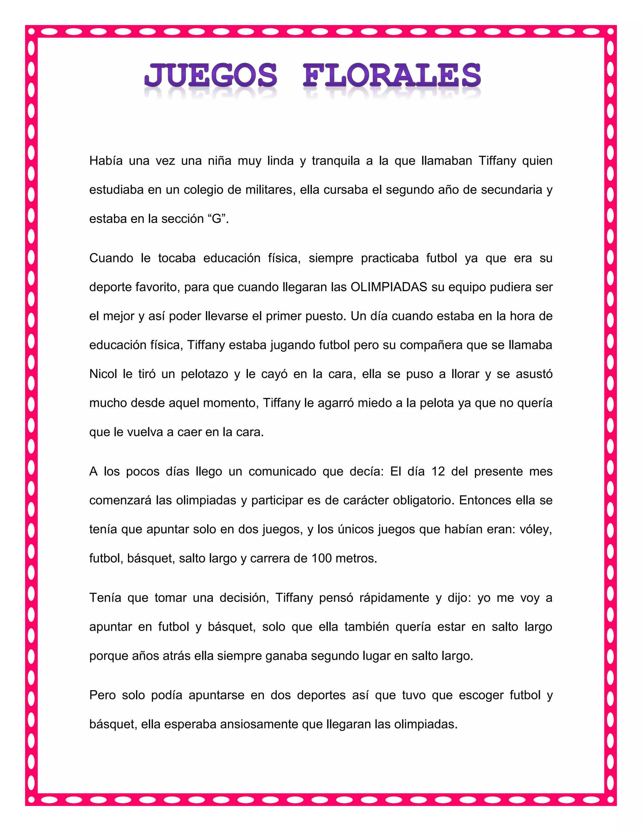 Tiffany era una niña que le gustaba jugar fútbol, pero después de un accidente le tuvo miedo a la pelota. Cuando comenzaron las olimpiadas escolares, Tiffany se inscribió en fútbol y básquetbol. A pesar de lastimarse la pierna jugando fútbol, pudo jugar básquetbol después y ganar medallas de oro en ambos deportes.