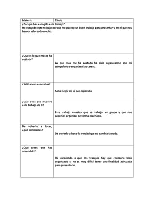 Este documento presenta las respuestas de un estudiante a preguntas sobre un trabajo escolar realizado en grupo. El estudiante explica que escogió el trabajo porque le pareció un buen proyecto en el que pusieron mucho esfuerzo. Aunque organizar el trabajo con su compañero fue difícil, el resultado final fue mejor de lo esperado y muestra sus habilidades para trabajar en equipo de manera ordenada. El estudiante no cambiaría nada del proceso y aprendió que la buena organización es clave para tener éxito al presentar un trabajo grupal.