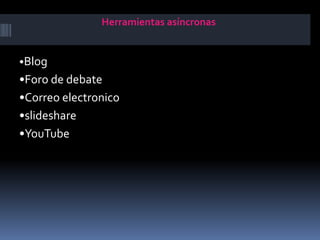 Este documento describe diferentes herramientas de comunicación asíncronas y síncronas. Entre las herramientas asíncronas se encuentran blogs, foros de debate, correo electrónico, SlideShare y YouTube. Las herramientas síncronas incluyen videoconferencias, chat, Skype, Twitter y Facebook. Cada herramienta se explica brevemente, describiendo su propósito y funcionalidad.