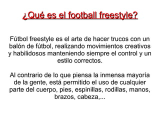 El fútbol freestyle es el arte de realizar trucos creativos con un balón de fútbol manteniendo siempre el control. Se originó en el siglo XX con acróbatas de circo como Enrico Rastelli. Hoy en día hay competiciones populares como "Nike Football". Los estilos incluyen movimientos con las piernas, el torso y sentado en el suelo. Los trucos van desde básicos como el toe bounce hasta avanzados como el knee mitchy abbas atw.