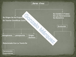 El documento discute varias teorías sobre el origen de la vida incluyendo la abiogénesis, la panspermia, el origen químico y la generación espontánea. Explica que la abiogénesis estudia cómo la vida pudo generarse a partir de materia inerte y que la panspermia sugiere que la vida comenzó en la Tierra gracias a semillas transportadas por el espacio. También describe brevemente la formación inicial de la Tierra y las teorías de la evolución de Lamarck y la selección natural.