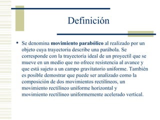 Este documento describe el movimiento parabólico como la trayectoria de un objeto en forma de parábola bajo la influencia de la gravedad. Explica que puede descomponerse en movimiento rectilíneo horizontal uniforme y movimiento vertical acelerado. Menciona dos tipos: lanzamiento horizontal y parabólico completo, e indica que un cuerpo lanzado verticalmente y otro parabólicamente tardan igual en caer si alcanzan la misma altura.