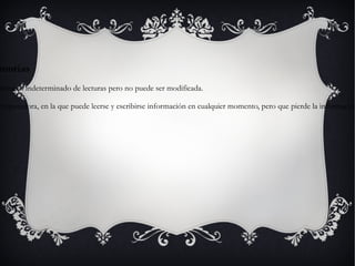 La memoria RAM almacena instrucciones y datos de forma temporal para que pueda acceder el procesador. Existen diferentes tipos de RAM como DRAM, SRAM y SDRAM, las cuales se diferencian principalmente en su velocidad y cómo retienen la información. Los módulos de memoria RAM contienen chips de memoria DRAM y permiten la identificación y comunicación con la computadora.