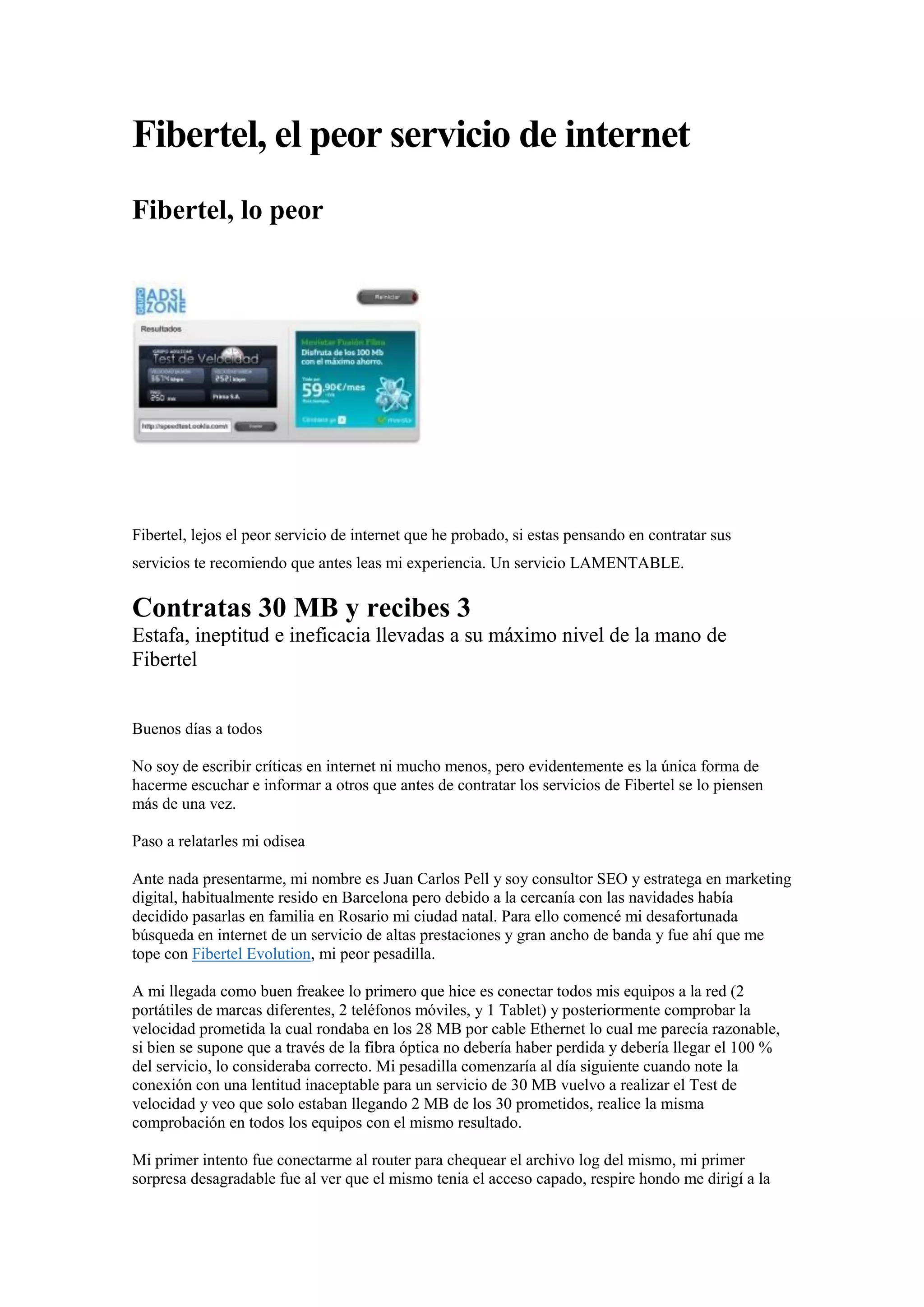 El documento presenta la experiencia negativa de un usuario con el servicio de internet de Fibertel en Rosario. Contrató un plan de 30 MB pero sólo recibía 3 MB, y los supuestos técnicos de Fibertel no pudieron resolver el problema durante varias llamadas y visitas. El usuario critica la falta de competencia y profesionalismo del servicio técnico de Fibertel, y advierte a otros que consideren seriamente no contratar este servicio debido a su mala calidad.