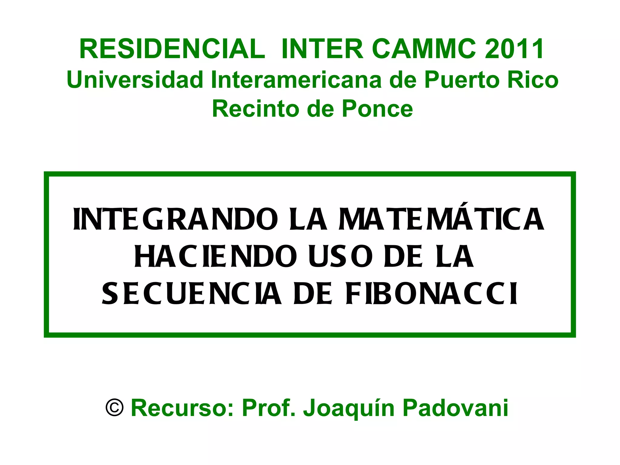 Este documento describe la secuencia de Fibonacci. Comienza con un par de conejos y cada mes la población aumenta según la suma de los conejos del mes anterior. Esto genera la secuencia 0, 1, 1, 2, 3, 5, 8, etc. donde cada número es la suma de los dos anteriores. La secuencia aparece comúnmente en la naturaleza y tiene muchas aplicaciones en matemáticas y ciencias.