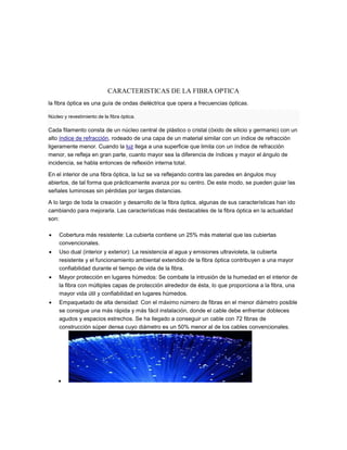 CARACTERISTICAS DE LAFIBRA OPTICA la fibra óptica es una guía de ondas dieléctrica que opera a frecuencias ópticas. Núcleo y revestimiento de la fibra óptica. Cada filamento consta de un núcleo central de plástico o cristal (óxido de silicio y germanio) con un alto índice de refracción, rodeado de una capa de un material similar con un índice de refracción ligeramente menor. Cuando la luz llega a una superficie que limita con un índice de refracción menor, se refleja en gran parte, cuanto mayor sea la diferencia de índices y mayor el ángulo de incidencia, se habla entonces de reflexión interna total. En el interior de una fibra óptica, la luz se va reflejando contra las paredes en ángulos muy abiertos, de tal forma que prácticamente avanza por su centro. De este modo, se pueden guiar las señales luminosas sin pérdidas por largas distancias. A lo largo de toda la creación y desarrollo de la fibra óptica, algunas de sus características han ido cambiando para mejorarla. Las características más destacables de la fibra óptica en la actualidad son:  Cobertura más resistente: La cubierta contiene un 25% más material que las cubiertas convencionales.  Uso dual (interior y exterior): La resistencia al agua y emisiones ultravioleta, la cubierta resistente y el funcionamiento ambiental extendido de la fibra óptica contribuyen a una mayor confiabilidad durante el tiempo de vida de la fibra.  Mayor protección en lugares húmedos: Se combate la intrusión de la humedad en el interior de la fibra con múltiples capas de protección alrededor de ésta, lo que proporciona a la fibra, una mayor vida útil y confiabilidad en lugares húmedos.  Empaquetado de alta densidad: Con el máximo número de fibras en el menor diámetro posible se consigue una más rápida y más fácil instalación, donde el cable debe enfrentar dobleces agudos y espacios estrechos. Se ha llegado a conseguir un cable con 72 fibras de construcción súper densa cuyo diámetro es un 50% menor al de los cables convencionales. 