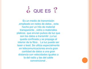 Este documento resume los conceptos básicos de la fibra óptica. Explica que la fibra óptica es un medio de transmisión de datos compuesto por un núcleo de vidrio u otro material transparente que guía la luz para transmitir datos a grandes distancias y velocidades. Detalla los elementos que la conforman, como el núcleo, la funda óptica y el revestimiento de protección, así como sus usos principales en telecomunicaciones y para transferir grandes cantidades de datos a alta velocidad.