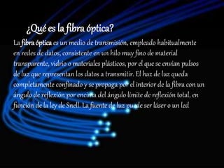 La fibra óptica es un medio de transmisión que consiste en un fino hilo de material transparente por el que se envían pulsos de luz que representan datos. Se utiliza ampliamente en telecomunicaciones debido a que permite enviar grandes cantidades de datos a largas distancias a alta velocidad. Está compuesta de un núcleo óptico formado por fibras de vidrio o plástico rodeadas de capas protectoras, y funciona transmitiendo la luz a lo largo del núcleo mediante reflexión total interna.