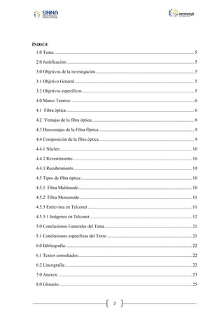 Este documento presenta información sobre fibra óptica monomodo y multimodo y su uso en Telconet. Explica brevemente las ventajas de la fibra óptica, su composición con el núcleo y recubrimiento, y los tipos de fibra óptica monomodo y multimodo. También incluye una entrevista realizada en Telconet sobre el uso de fibra óptica en sus redes de telecomunicaciones.