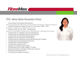 1) Alma Delia Gonzalez es instructora de telecomunicaciones en Fibremex con certificaciones en cableado estructurado, fibra óptica y equipos de red. 2) Tiene experiencia previa como consultora e integradora de cableado estructurado. 3) Actualmente capacita en Fibremex sobre instalación de fibra óptica interior y cableado estructurado.