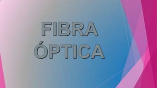 La fibra óptica es un medio de transmisión utilizado en redes de datos que consiste en un fino hilo de material transparente como vidrio o plástico por el que se envían pulsos de luz que representan los datos. Funciona guiando la luz a través de un núcleo con un índice de refracción mayor que el revestimiento circundante, lo que hace que la luz se refleje y se propague a lo largo de la fibra. Tiene ventajas como una gran ancho de banda, ocupa poco espacio, es flexible y ligera