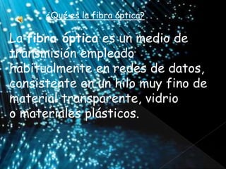La fibra óptica se utiliza comúnmente en redes de datos y consiste en un fino hilo de vidrio u otros materiales transparentes que transmiten luz a largas distancias sin alterar las señales digitales. Se compone de un núcleo central rodeado por revestimientos protectores y se usa principalmente donde se necesita un alto ancho de banda, como en redes informáticas interurbanas.