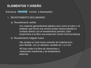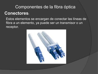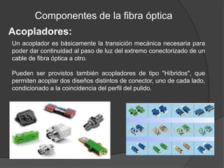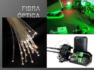Este documento describe la historia, proceso de fabricación, aplicaciones y características de la fibra óptica. Explica que la fibra óptica consta de un núcleo de vidrio con un índice de refracción más alto rodeado por una cubierta protectora, y que se usa para transmitir luz a largas distancias en aplicaciones de telecomunicaciones y sensores. También resume los diferentes tipos de fibra óptica y componentes asociados como conectores y cables.