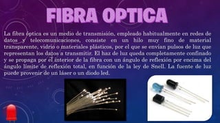 El documento describe las características y usos del cable de fibra óptica. La fibra óptica transmite datos digitalizados en forma de pulsos de luz a través de hilos de vidrio extremadamente delgados. Puede transmitir datos a velocidades muy altas y a largas distancias sin atenuación de la señal. La fibra óptica es un medio de transmisión comúnmente usado en redes de datos y telecomunicaciones.